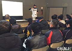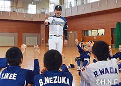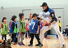北広島市と北海道日本ハムファイターズは2月17日(土)、今年1月に提携したパートナー協定の連携事業第1弾として野球少年ら市民179人を対象にした講習会「スポーツ・コミュニティin北広島」を同市総合体育館で開催しました。ベースボールアカデミーの牧谷宇佐美、杉山俊介両コーチが小中学生の球児や野球に興味を持つ未就学児らを指導したほか、肘検診、保護者向けの食育講座や指導者を対象としたコーチング講座などをカテゴリー別に実施しました。