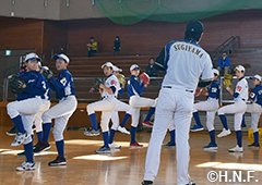 未就学児らに行ったベースボール体験会では、牧谷コーチがストラックアウトやカラーコーンに乗せたボールを打つといったメニューを取り入れ、初めてバットを振った子も鋭い当たりを飛ばして大喜びしていました。経験者向けの冬季トレーニング教室では、杉山コーチが投げる際にグラブを持った手で「壁ドンするイメージで」と分かりやすく要領を伝えていきました。参加した北広島シニアの小林大悟主将は「投げるのも打つのも軸足にしっかり体重を乗せることが大切だと分かりました」と充実した表情を見せていました。