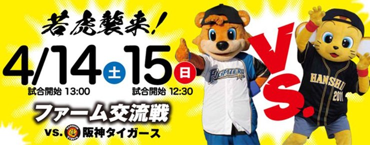 ファイターズ鎌ケ谷スタジアムでは、4月14日(土)と15日(日)にウエスタン・リーグに所属する阪神タイガースを招いてのファーム交流戦を開催します。交流戦ならではの企画チケットも続々と登場。前売券はファンクラブ先行が3月10日(土)、一般販売が3月11日(日)よりファイターズ鎌ケ谷スタジアムチケット売場、球団HP「チョッQR」にて販売が開始されます。阪神タイガースの人気マスコットキャラクター「キー太」も2年ぶりの鎌スタ来場が決定。この機会をお見逃しなく!