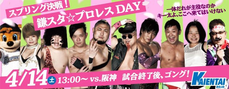 4月14日(土)の試合終了後、球場正面広場での特設リングで人気イベント「鎌スタ☆プロレスDAY~スプリング決戦」を開催します。千葉市中央区に本拠地を構える「KAIENTAI DOJO」と共同して行う異種競技ダブルヘッダー。ファイターズ?タイガース?それともキー太?一体誰が主役なのか、野球の試合後に行われるレスラーたちの熱い戦いにもご注目ください。