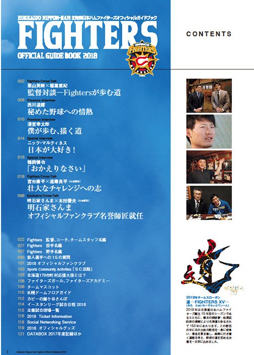 | 掲載 内容 | [エクスクルーシブクロストーク] 「明石家さんま×木田優夫(GM補佐)」オフィシャルファンクラブ名誉師匠就任 [ファイターズクロストーク] 「栗山英樹×稲葉篤紀」監督対談―Fightersが歩む道 「宮台康平×遠藤良平(GM補佐)」壮大なチャレンジへの志 [インタビュー] 「西川遥輝」秘めた野球への情熱 「清宮幸太郎」僕が歩む、描く道 「ニック・マルティネス」日本が大好き! 「鶴岡慎也」おかえりなさい [企画] 「新人選手への15の質問」 球団インフォメーション ほか |