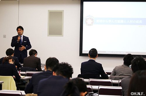 北海道日本ハムファイターズは3月20日(火)、札幌市内で「北海道スポーツ&エンターテインメント・カレッジ」を開催いたしました。北海道日本ハムファイターズ15thプロジェクトの一環として、北海道のスポーツ&エンターテインメントの更なる活性化やイノベーションの創出について考え、新たな夢への挑戦を担う人材育成・開発を目的としたもので、今回は1月に続く第2回。主に北海道の企業や団体に所属する20~30代を中心とした約50名にご参加いただきました。