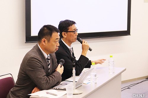 続いて「企業×メディア×スポーツの融合とその可能性」と題し、北海道テレビ放送(株)の福屋渉編成局長と(株)北海道日本ハムファイターズ事業統轄本部・森野貴史ゲストリレーション部部長によるパネルディスカッションが行われました。