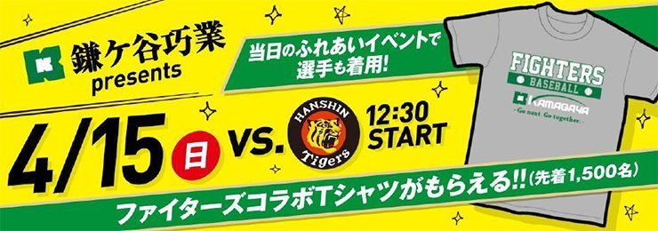15日(日)はファイターズ鎌ケ谷スタジアムの地元企業スポンサーである「鎌ケ谷巧業株式会社」様より、先着1,500名のご来場の皆様へオリジナルのファイターズコラボTシャツをプレゼントします。このTシャツは、試合終了後に行われるふれあいイベントでファイターズ選手たちも着用する予定です。