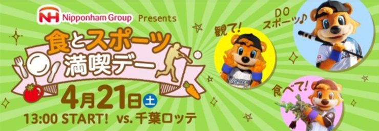 ファイターズ鎌ケ谷スタジアムでは、4月21日(土)のイースタン・リーグ公式戦、千葉ロッテマリーンズ戦において、≪ニッポンハムグループPresents食とスポーツ満喫DAY≫を好評につき今年も開催します。日本ハム(株)管理栄養士監修の栄養バランスを考えたワンプレートメニューの販売や、カラダを動かすプログラム、アトラクションコーナーなど様々な「食」と「スポーツ」を満喫できるイベントをご用意しております。野球を見てエキサイトし、カラダを動かして食べて元気に!ぜひ≪食とスポーツ満喫DAY≫にお越しください。