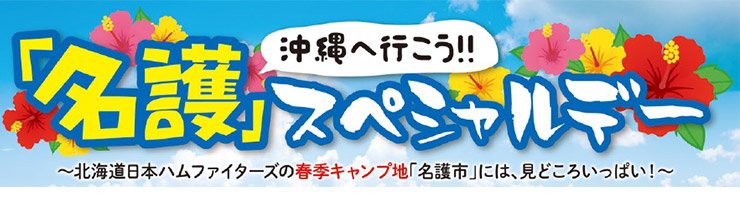 「沖縄へ行こう!名護スペシャルデー」ご来場者の中から抽選で、ANAで行く3泊4日ペア沖縄旅行をはじめ、名護市有名ホテルの宿泊券、観光施設の入場券や特産品などステキなプレゼントが当たります!ファイターズ戦を観戦して夢の沖縄旅行をGETしよう!