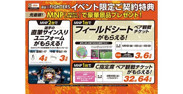 | ご契約 特典 | 【MNP2台ご契約】 先着合計7名様に、西川遥輝選手・中島卓也選手の直筆サイン入りユニフォームをプレゼント! 西川選手:4名様 中島選手:3名様 |
