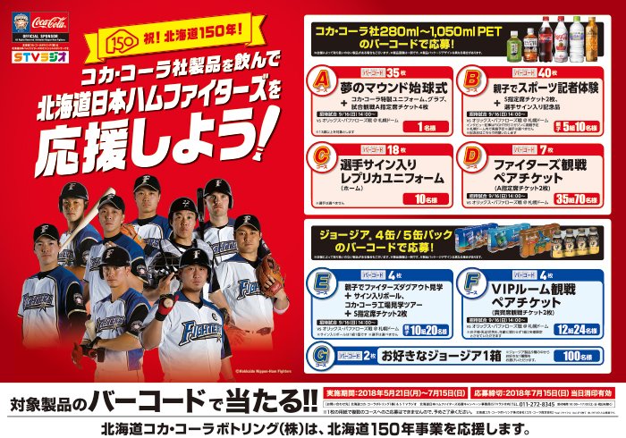北海道コカ・コーラボトリング株式会社では、『祝!北海道150年!コカ・コーラ社製品を飲んで北海道日本ハムファイターズを応援しよう!』キャンペーンを実施中です。