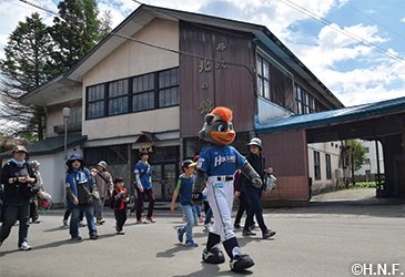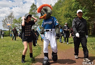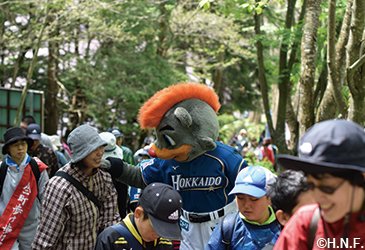 北海道日本ハムファイターズでは5月20日(日)、北海道栗山町で開催されたウォーキングイベント「第48回くりやま歩けあるけ運動」に北海道150年事業で「みらい大志」を務めるB☆Bが参加しました。栗山公園を発着点に、町内外の3歳から83歳までの約160人と2時間かけて4.2キロのコースを巡りました。