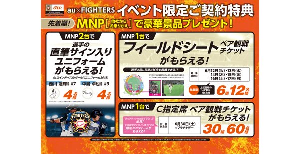 | ご契約 特典 | 【MNP2台ご契約】 先着合計8名様に、西川遥輝選手・中島卓也選手の直筆サイン入りユニフォームをプレゼント! 西川選手:4名様 中島卓選手:4名様 |