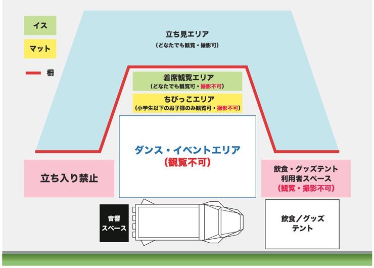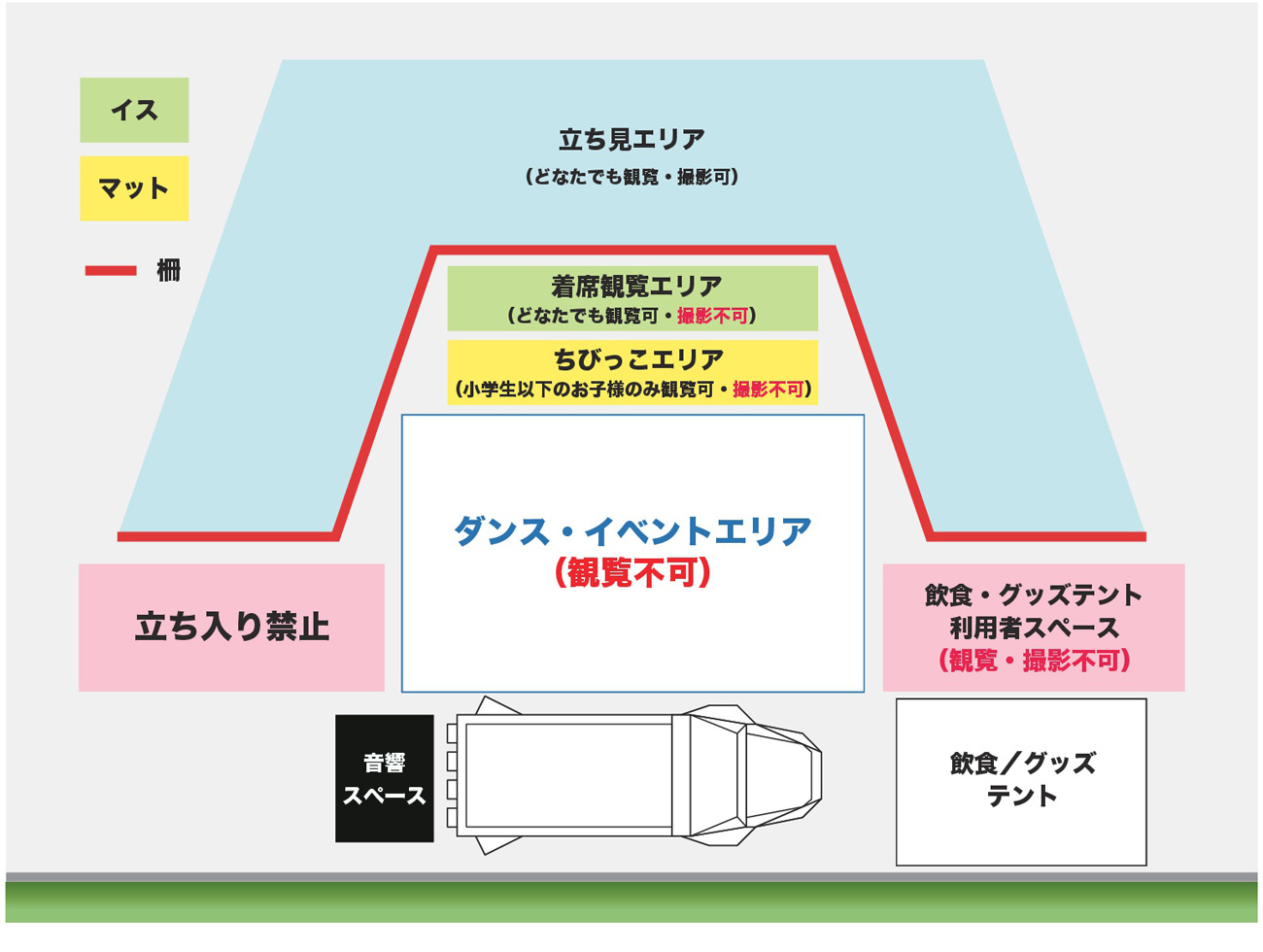 ちびっこエリア(※撮影不可)、着席観覧エリア(※撮影不可)、立ち見エリア(※撮影可)の3つのエリアを設けさせていただきます。ステージ前は限られたスペースですので、譲り合いの上ご観覧くださいますようお願い申し上げます。 - ●場所取りについて