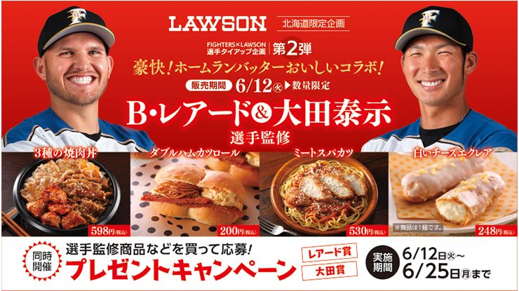 FIGHTERSオフィシャルスポンサーのローソンでは、「FIGHTERS選手タイアップ企画 第二弾 豪快!ホームランバッターおいしいコラボ!B・レアード選手、大田泰示選手 監修商品」を、6月12日(火)から発売します。
