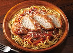 “ジャストミートでスパッと勝つ!”初登場 大田選手の監修商品は、トマト感のあるミートソースをたっぷりと使用し、カツをトッピングしたバランス良く仕上げたミートソーススパゲティです。