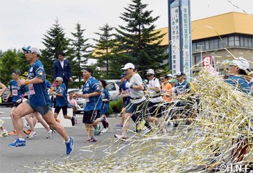 北海道日本ハムファイターズと北広島市は6月24日(日)、今年1月に締結したパートナー協定に基づく連携事業の一環で、「きたひろしま30kmロードレース」(北広島市総合体育館前発着)にファイターズラン部門(5km)を新設して開催し、ロードレース終了後に同体育館隣の平和の塔公園で東北楽天ゴールデンイーグルス戦(楽天生命パーク)のパブリックビューイングを実施しました。