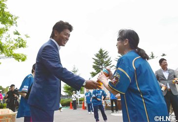 ファイターズランのスターターを稲葉篤紀スポーツ・コミュニティ・オフィサー(SCO)が務め、号砲とともに約210人のランナーが参加特典の北海道スカイブルーユニフォームを身にまとって一斉にスタート。最高気温21度と汗ばむ陽気の中、時折野幌原始林から吹き寄せるさわやかな風を感じながら、エルフィンロード(きたひろしまサイクリングロード)を思い思いのペースで駆け抜けていました。ゴール地点では稲葉SCOとファイターズOBの稲田直人さんが無事ゴールされた参加者の皆様を出迎え、ねぎらいの言葉をかけながらドリンクを手渡していました。