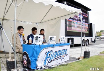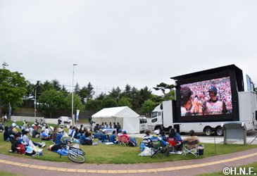 パブリックビューイング会場には270インチの大型オーロラビジョンが設置され、稲葉SCOと稲田さんがSTV永井公彦アナウンサーと掛け合いをしながらイーグルス戦の模様を解説しました。一日を振り返り、稲葉SCOは「大会に参加する、それを応援する、支える人がいるというようにスポーツの素晴らしさが凝縮されていました。北広島市は緑も豊かですし、スポーツに適した環境が整ったマチ。いろいろな発想を掛け合わせれば、まだまだ夢や可能性が広がっていくと思います」と話していました。