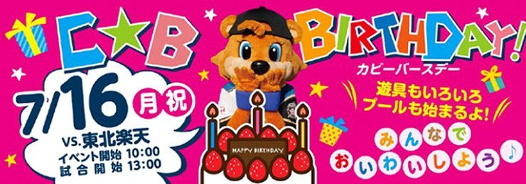 毎年「海の日」はC☆B(愛称:カビー)の誕生日。皆さん、一緒にカビーの誕生日をお祝いしませんか?スペシャルゲストの登場や、試合終了後には雨天中止となった4月15日(日)の振替実施となる選手とのふれあいイベントも行いますので、皆様お誘いあわせの上、鎌スタへお越しください。