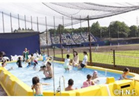 ライト側ファウルエリアにある『鎌スタ☆プール』を今年もオープンします!昨年はテレビのバラエティ番組やニュースでも取り上げられた国内唯一のプール付き観戦エリア。カビーの誕生日、海の日の7月16日(月・祝)より8月にかけての試合日、非試合日の土日祝日に限定されて営業します。
