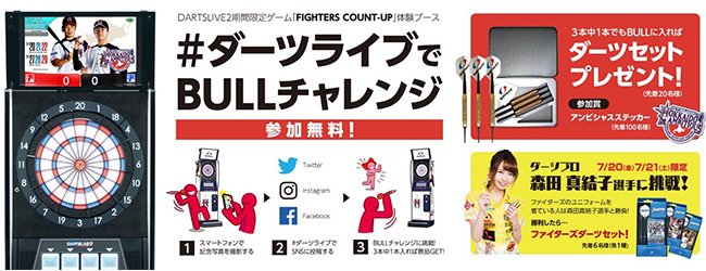 当日「#ダーツライブ」でSNSに投稿された方は、無料で『FIGHTERS COUNT-UP』BULLチャレンジに挑戦できます。ダーツを3本投げていただき、1本でもBULLに入れることに成功した先着20名様(各日)に「マイダーツセット」をプレゼント。また、参加賞として先着100名様(各日)に「AMBITIOUSロゴステッカー」をプレゼントいたします。さらに7月20日(金)、21日(土)にファイターズのユニフォームを着用して参加した方は、プロダーツプレイヤーの森田真結子選手に挑戦!見事勝利できれば森田真結子選手のサイン入り「DARTSLIVE×FIGHTERS Darts Set」をプレゼント!