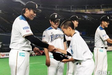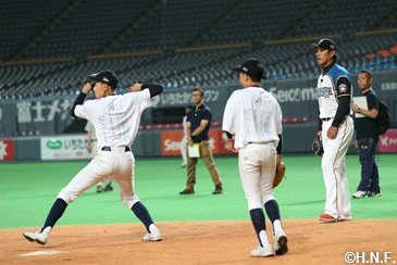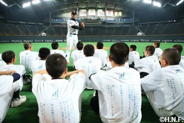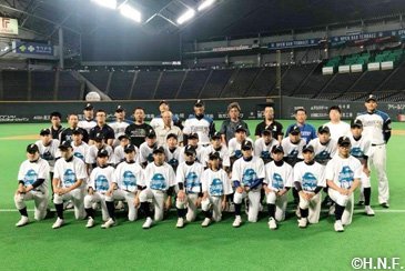 北海道日本ハムファイターズは7月21日(土)の福岡ソフトバンクホークス戦終了後、札幌ドームで稲葉篤紀スポーツ・コミュニティ・オフィサー(SCO)をメインコーチとする中学生対象の野球教室「稲葉SCOフィールドクラブin札幌ドーム」を開催しました。北海道内各地から硬式野球団体に所属する選手30人と軟式野球を含む指導者9人が参加。プロが試合を行った余韻の残るグラウンド上で約1時間半、熱のこもった指導が展開されました。