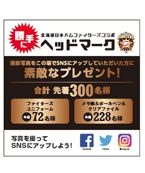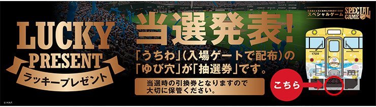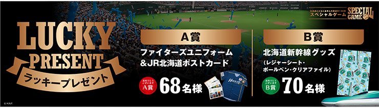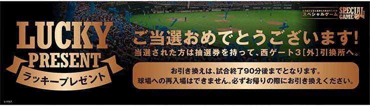 | 当選賞品 の引換え | 7回裏終了から試合終了後のフィールドイベント終了時まで 札幌ドーム西ゲート3にて交換いたします。(再入場不可、当日のみ) | |