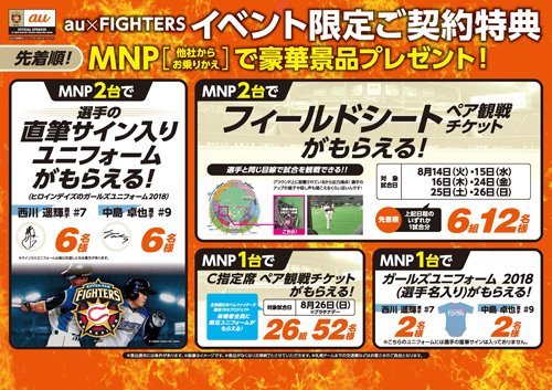 | 【MNP1台ご契約】 先着26組52名様に、8月26日(日)(プラチナデー)のC指定席ペア観戦チケットをプレゼント! この日は「北海道日本ハムファイターズ誕生15thプロジェクト」として、来場者全員に限定ユニフォームがもらえる日! まだチケットをお持ちでない方は必見です! | |