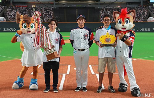 試合前セレモニーでは、『なまらうまいっしょ!グランプリ』大会委員長の栗山英樹監督から、井澤克典さん・宮本孝之さんにトロフィーと記念品の王冠が贈られました。