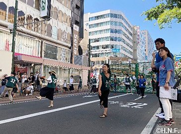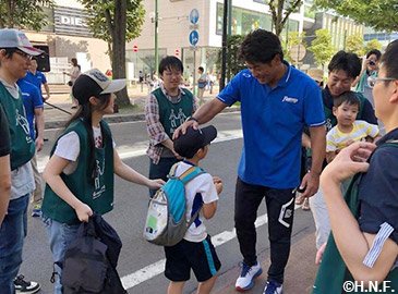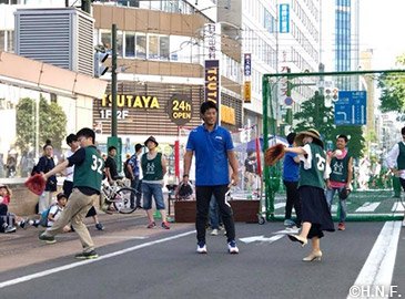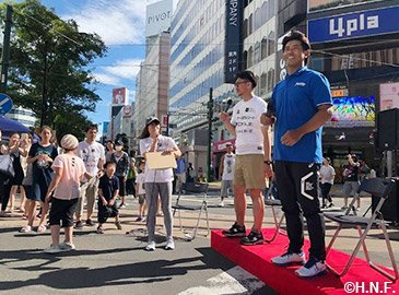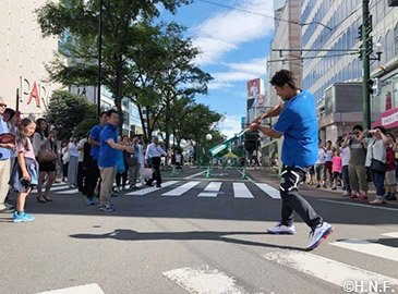 札幌駅前通(札幌市中央区南1条~3条)と南一条通(札幌市中央区南1条西2丁目、3丁目)の一角が歩行者天国になった7月28日(土)、「まちなか運動会 in TOWN PICNIC Sapporo 2018」が開催され、北海道日本ハムファイターズから稲葉篤紀スポーツ・コミュニティ・オフィサー(SCO)が参加して野球教室やトークショーを行いました。