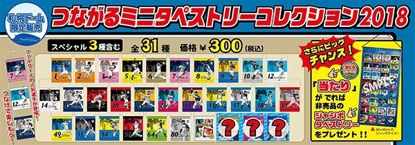 札幌ドーム限定で販売している「つながるミニタペストリーコレクション2018」が8月7日(火)から1個300円(税込)のところ5個セット1,000円(税込)で販売をいたします。なくなり次第終了となりますのでこの機会にご利用ください。