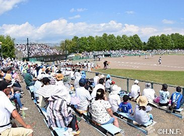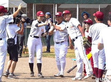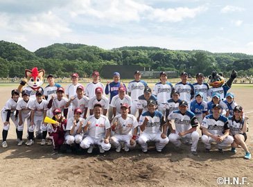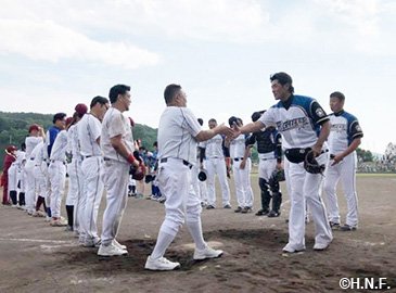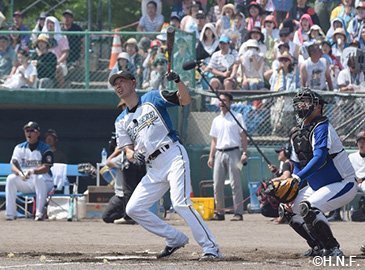 北海道日本ハムファイターズ誕生15thプロジェクト『サマーベースボールフェスティバル』が8月3日(金)、三笠市営球場で開催された熱烈!ホットサンド!プレゼンツ「稲葉篤紀軍団 vs.サンドウィッチマン軍団」で幕を開けました。気温27度、青空が広がる絶好のコンディションのもと、元プロ選手や野球好き芸能人の方たちが笑いあり、迫力ありのプレーを繰り広げ、内外野を埋めた2,236人から大きな歓声が上がっていました。