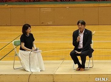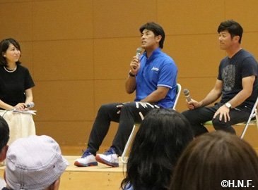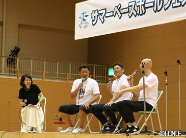 8月3日(金)夕張市内で、今年初開催の「サマーベースボールフェスティバル」を大いに盛り上げてくださっている豪華ファイターズOB陣(稲葉SCO、岩本勉さん、建山義紀さん、稲田直人さん、森本稀哲さん)、そしてこの日イースタン・リーグ北海道遠征で来道した荒木大輔ファーム監督が加わってのスペシャルトークショーが開催されました。