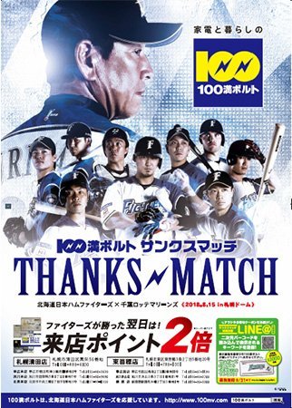 札幌ドーム内に掲出する「100満ボルトサンクスマッチ」のポスターに記載されるQRコードを読み込み、LINE友達登録しよう!北海道100満ボルト各店舗にお越しいただき、LINE登録画面を各店舗スタッフにお見せいただくと、先着3,000名様にファイターズオリジナルタオルをプレゼントさせて頂きます!この機会にぜひ、100満ボルトLINE@にご登録をお願いします。