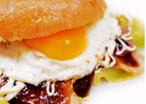 | 富良野地養豚を使ったてりやきバーガー。テリヤキソースには北海道産の果物(リンゴ)を使用し、フルーティーに仕上げました。 | ||