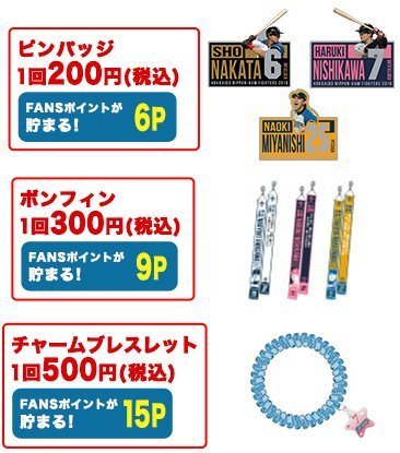 ガチャポンは、おなじみのピンバッジ(第二弾)、ボンフィンに加え、アクセサリーやブレスレットとしても楽しめるチャームブレスレットが東京ドームに初登場♪更にチャームブレスレットは2回お買上げ毎にピンバッジ(第一弾)をお一つプレゼント!Let'sガチャポン♪