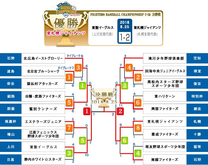 北海道日本ハムファイターズが主催する少年野球大会「2018 FIGHTERS BASEBALL CHAMPIONSHIP U-12」は8月25日(土)札幌ドームで決勝が行われ、札幌支部代表の東札幌ジャイアンツが上川支部代表の東聖イーグルスに勝利し初優勝を果たしました。