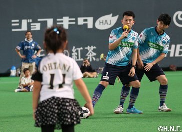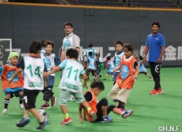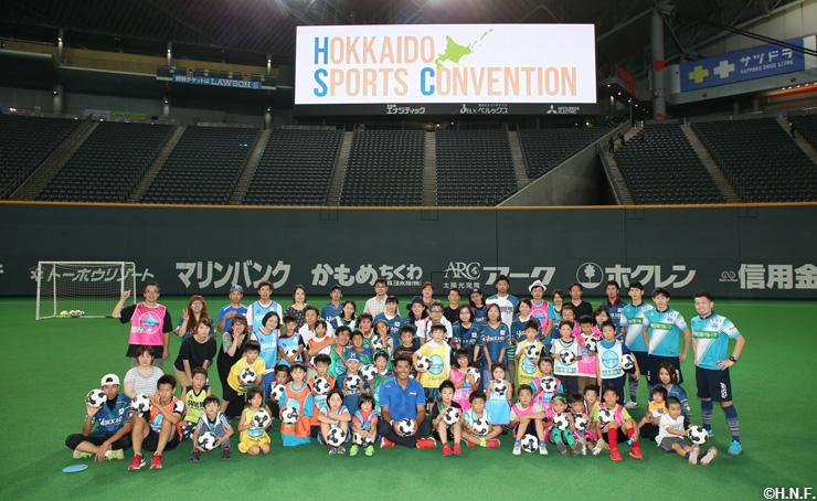 北海道日本ハムファイターズは8月26日(日)の東北楽天ゴールデンイーグルス戦終了後、札幌ドームで稲葉篤紀スポーツ・コミュニティ・オフィサー(SCO)とDUARIG Fリーグ2018/2019 ディビジョン1所属のフットサルチーム、エスポラーダ北海道による「北海道スポーツコンベンション」を開催しました。エスポラーダからはキャプテンの三浦拓選手と山本真太郎選手、鹿内都夢選手が参加。小学1年生から4年生までの児童と保護者の方ら35組70人を対象に、レフト側外野人工芝の上で1時間汗を流しました。