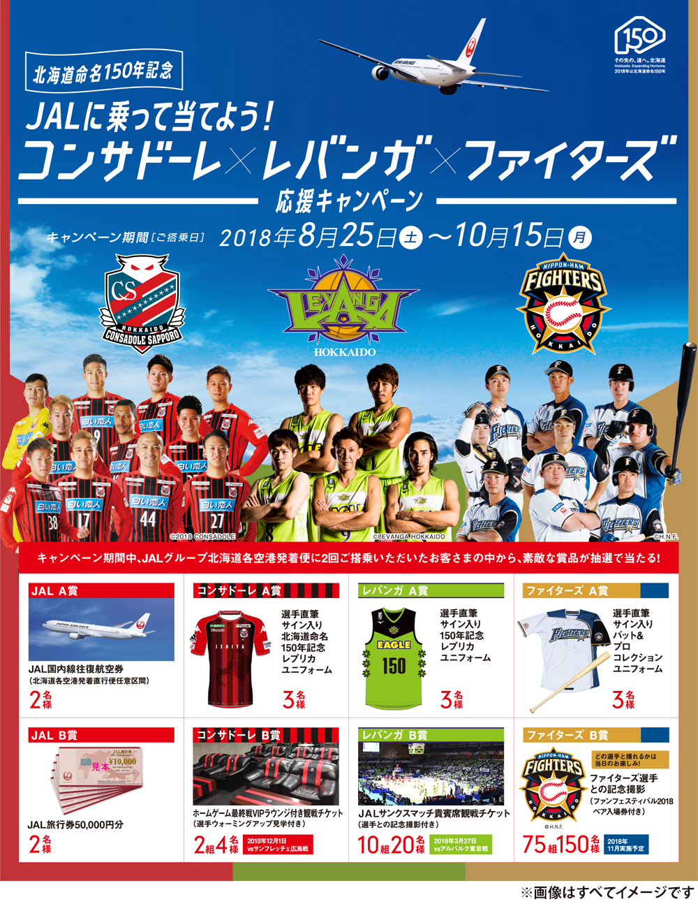 日本航空では、8月25日(土)から10月15日(月)までの期間、「北海道命名150年記念 JALに乗って当てよう!コンサドーレ×レバンガ×ファイターズ応援キャンペーン」を実施中です。キャンペーン期間中、JALグループ北海道各空港発着便に対象運賃で2回ご搭乗いただいたお客さまの中から抽選で、「ファイターズ選手との記念撮影(ファンフェスティバル2018ペア入場券付き)」をはじめ、コンサドーレ賞やレバンガ賞、JAL賞など素敵な賞品が当たります。皆さまのご応募をお待ちしております。