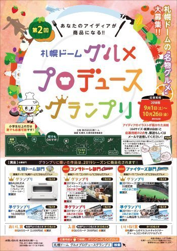 | 応募先 | 【郵送】 〒062-0045 札幌市豊平区羊ケ丘1番地 株式会社札幌ドーム「グルメプロデュースグランプリ」係 【メール】 hiroba@sapporo-dome.co.jp ※件名を「グルメプロデュースグランプリ」としてください。 |