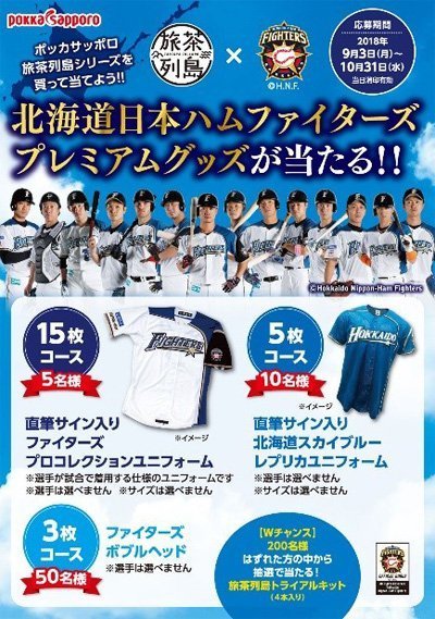 9月3日(月)から加賀棒ほうじ茶・富良野ラベンダーティーをはじめとするポッカサッポロ旅茶列島シリーズを対象としたキャンペーンを実施中。直筆サイン入りファイターズプロコレクションユニフォームや直筆サイン入り北海道スカイブルーレプリカユニフォームが当たります。
