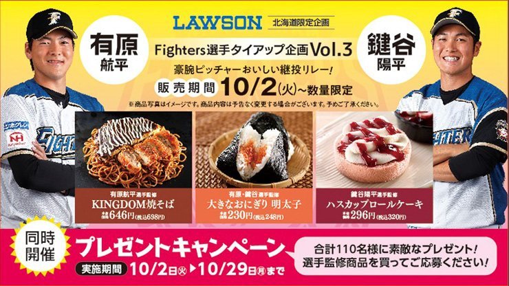 FIGHTERSオフィシャルスポンサーであるローソンでは、毎年恒例となりましたFIGHTERSとタイアップした北海道限定企画として、「FIGHTERS選手タイアップ企画 第3弾 豪腕ピッチャーおいしい継投リレー!有原航平投手・鍵谷陽平投手 監修商品」を、10月2日(火)から発売します。