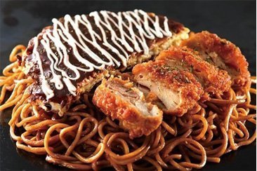 もっちり麺の焼そばに、フライドチキンとお好み焼をトッピングしたボリュームたっぷりの焼そばです。大きな体の有原投手の名前に恥じないボリュームたっぷりの焼そばに仕上げました。(麺やお好み焼は北海道産小麦使用)