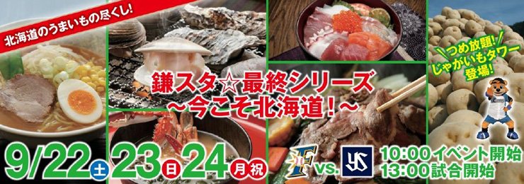 今シーズンの最後を締めくくる秋の一大イベント《鎌スタ☆最終シリーズ今こそ北海道!》の開催もいよいよ目前に迫ってまいりました。2Fコンコースには平成30年北海道胆振東部地震で被災された方への義援金を募る募金箱が設置されるほか、毎年恒例の北海道グルメに加え、今年は北海道各地をイメージしたイベントが満載。“大”満足・“大”興奮間違いなしの3日間です。皆様のご来場をお待ちしております。