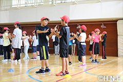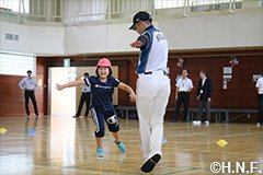 北海道日本ハムファイターズの村田和哉ベースボールアカデミーコーチが9月14日(金)、北広島市立双葉小学校で体育授業を実施し、小学3、4年生の児童に運動指導を行いました。
