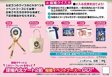 入場ゲートでご来場15,000名様にお配りするリーフレットと当日のチケットを、北ゲート2前「国産鶏肉 桜姫®特設ブース」にお持ちいただいた方で、桜姫に関するクイズに正解すると、その場で抽選会に参加できます。選手のサイン入りグッズをはじめ、桜姫産地パックセットなど、素敵な賞品が合計1,645名様に当たります。お楽しみに!!