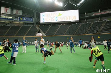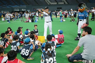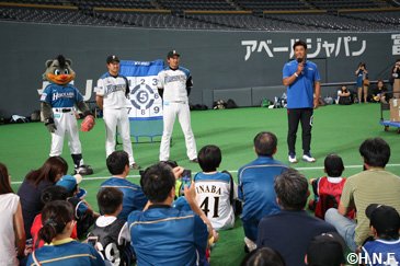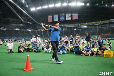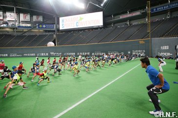 北海道日本ハムファイターズは9月17日(月・祝)のオリックス・バファローズ戦終了後、札幌ドームで稲葉篤紀スポーツ・コミュニティ・オフィサー(SCO)とアカデミーグループの牧谷宇佐美、須永英輝コーチによる「北海道スポーツコンベンション」を開催しました。小学1年生から4年生までの児童と保護者の方ら50組100人を対象に、B☆Bも参加して勝利の余韻残るライト側外野人工芝の上で1時間汗を流しました。