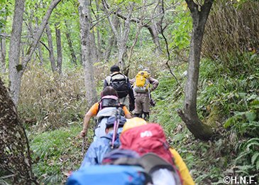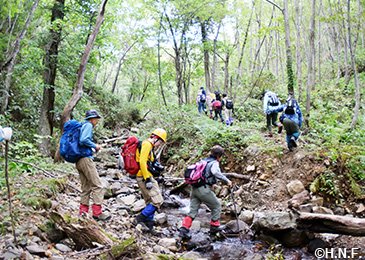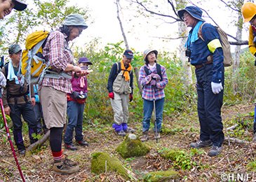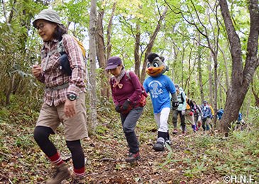 増毛町別苅と石狩市浜益区幌を結ぶ全長32キロの増毛山道は、1857年(安政4年)に交易・生活路として開削され、北海道の名付け親とされる幕末の探検家・松浦武四郎も検分に訪れた際に「蝦夷地第一の出来栄え」と記しています。その後荒廃が進んでいましたが、NPO「増毛山道の会」が8年かけて笹刈りして2016年に復元しました。年8回あるトレッキングツアーのうち、今回は増毛町岩尾から石狩市幌までの17キロのコースを球団との連動企画として実施し、B☆Bも標高180メートルの地点まで20人の参加者の皆さまと古道ならではの雰囲気を体感しました。