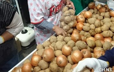 「ホクレン特設ブース」では、北海道日本ハムファイターズ 北海道胆振東部地震の義援金賛同企画として、200円以上チャリティー募金をいただいた方にチャレンジしていただける「じゃがいも・玉ねぎ詰め放題10秒チャレンジコーナー」を設置いたします。