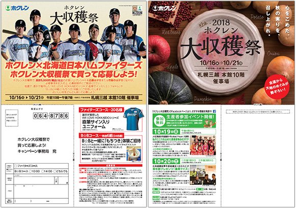 10月16日(火)から札幌三越本館10階催事場で開催されるホクレン大収穫祭において、合計5,000円(税込)以上お買い上げいただき、そのレシートを応募ハガキまたは市販のはがきに貼り付け、必要事項をご記入の上、応募期間内にご応募いただくと、抽選で選手が着用した「WE LOVE HOKKAIDO シリーズの直筆サイン入りユニフォーム」や、くるるの杜で12月に開催予定のB☆Bと一緒に行う「もちつき体験」にご招待いたします。お楽しみに!