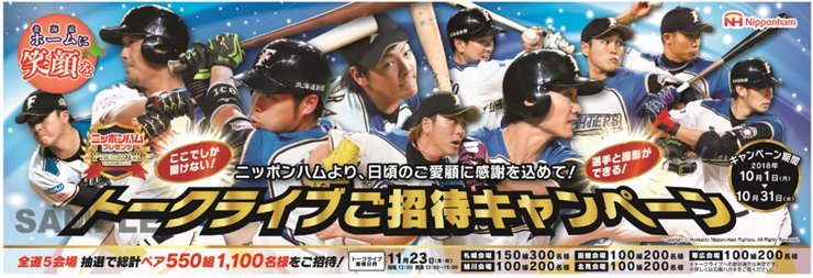 日本ハム株式会社では、ファイターズファンの皆様からの日頃の熱いご声援に感謝の気持ちを込めて、ファイターズ選手による「プレミアムトークライブ」へ、抽選で550組1100名様をご招待するキャンペーンを、北海道限定企画として実施いたします。毎年恒例となっているこの企画、ファイターズの選手たちが道内各地全5会場に訪問して開催する楽しいトークショー。ここでしか聞けない本音トークも飛び出す企画満載のトークイベントです。キャンペーンは10月1日(月)~10月31日(水)まで。期間中にお買い上げいただいたニッポンハム商品500円分以上を含むお買い上げレシートをはがきに貼ってご応募ください。キャンペーンの詳しい内容は、道内のスーパーマーケットやコンビニエンスストア・食料品店などの各店頭などでもお知らせいたしております。