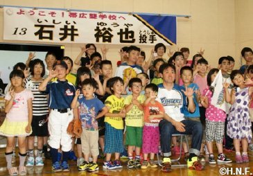 最後に交流を深めてきた帯広聾学校の子どもたちから「ありがとうございました。お疲れ様でした」花束とプレゼントを手渡された石井裕投手は「ありがとう」と子どもたちと握手し、笑顔で会見を終えました。